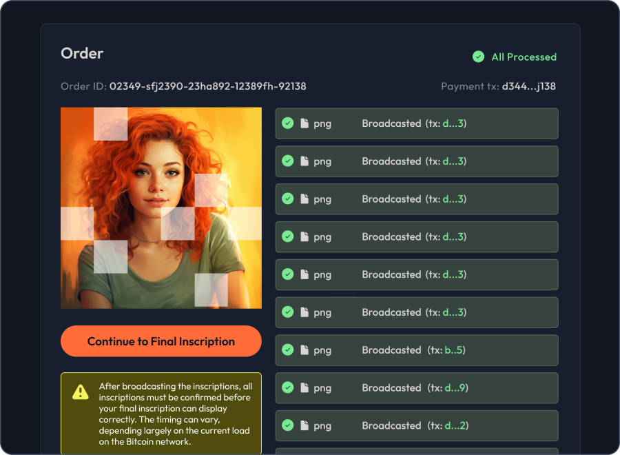 Break free from the 4MB block size limit on Bitcoin. With Canvas, you can inscribe massive artwork (up to 50MB) by easily splitting it into smaller pieces. Control the slicing process and finalize your inscriptions with just a few clicks, all with zero platform fees.