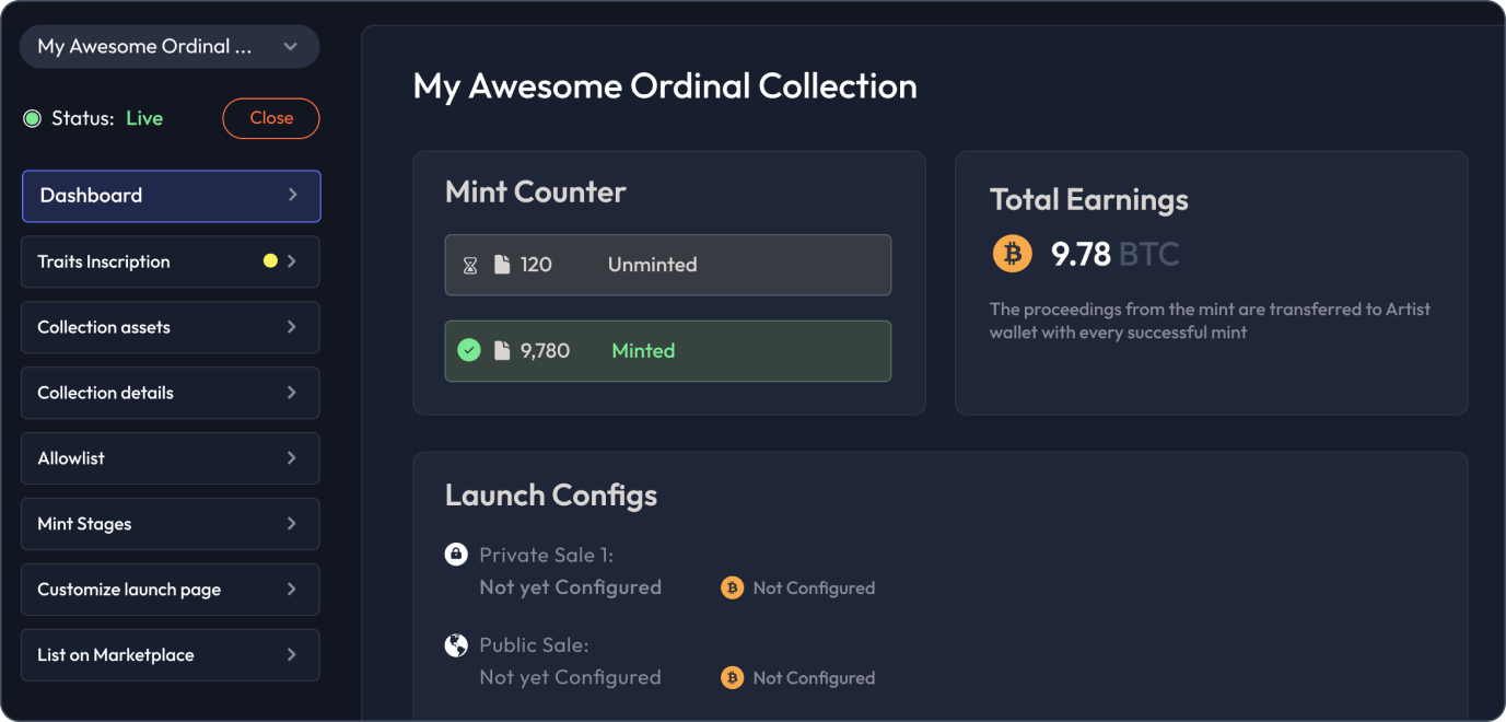 Drag and drop layers to build PFP collections with detailed traits and rarities. Import existing Ordinals, fine-tune settings, and inscribe on-chain metadata in one click. Launch with Oviato or our partners, all with zero platform fees for a limited time.